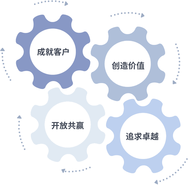 成就客户是一切决策的出发点,,创造价值是衡量所有工作的标准,,追求卓越是我们做事做人的态度,,,,开放共赢是我们的格局也是最终的结果。。。价值观的齿轮环环相扣,,推动着组织里的每个人不断向前。。。。
