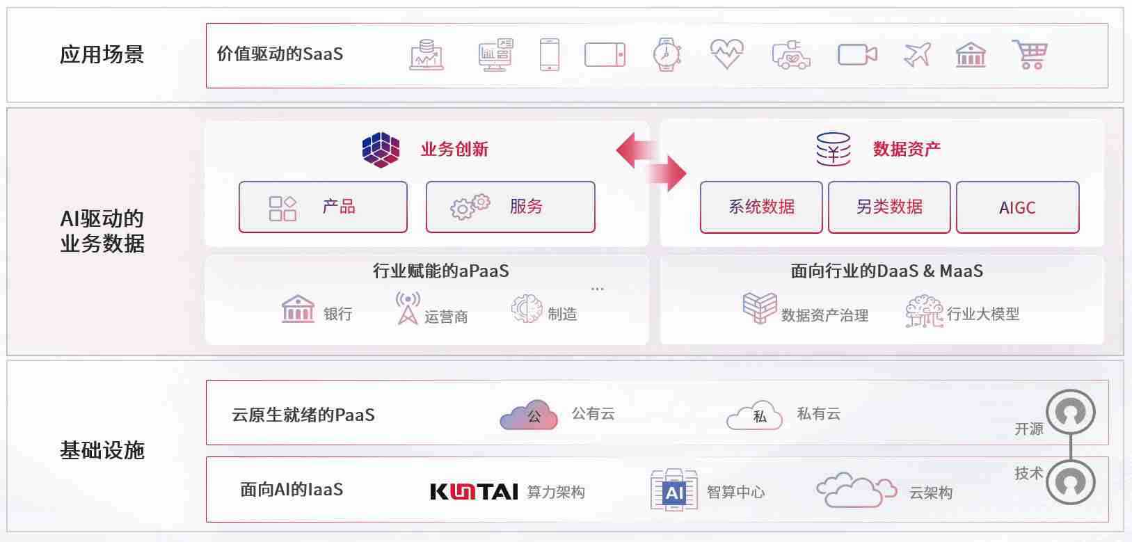 数字时代,,,围绕企业数字化转型的关键要素,,,Z6尊龙数码开创性的提出数云融合战略和技术体系框架,,,着力在云原生、、、、数字原生、、、、AI原生和信创产业上架构产品和服务能力,,,为处在不同数字化转型阶段的快消零售、、汽车、、、金融、、、、医疗、、、、政企、、、、教育、、、运营商等行业客户提供泛在的敏捷IT能力和融合的数据驱动能力,,,构建跨界融合创新的数字业务场景和新业务模式,,助力企业级客户建立面向未来的核心能力和竞争优势,,,,全面推动社会的数字化、、智能化转型升级。。